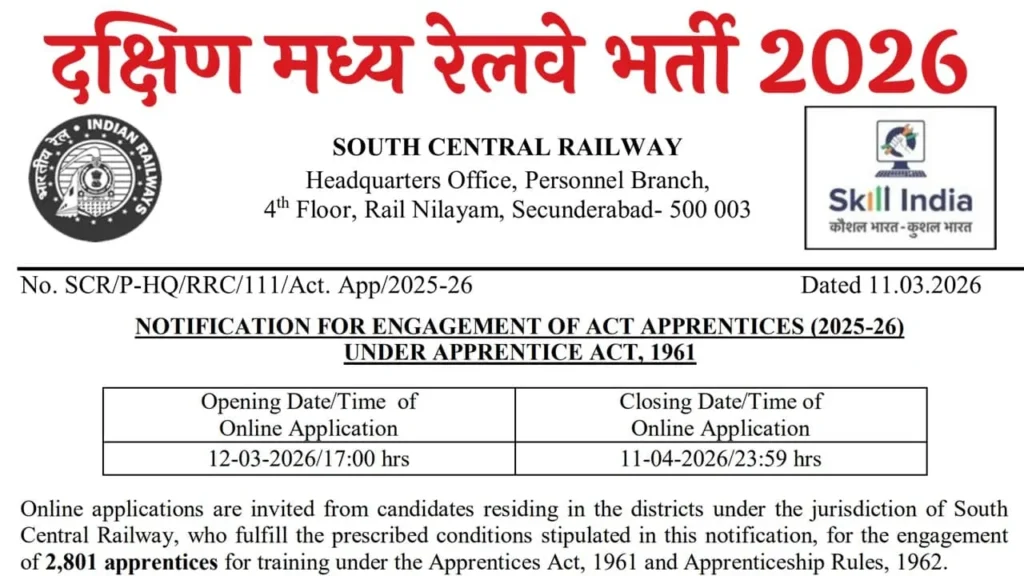 South Central Railway (SCR) ने वर्ष 2026 के लिए Act Apprentice भर्ती का OFFICIAL NOTIFICATION जारी कर दिया है। इस भर्ती के तहत विभिन्न ट्रेड में कुल 2801 पदों पर Candidates का चयन किया जाएगा। यह भर्ती विशेष रूप से उन Candidates के लिए एक शानदार अवसर है जिन्होंने 10वीं कक्षा और आईटीआई पास की है और रेलवे में करियर बनाना चाहते हैं।